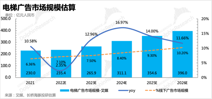 上面讨论了梯媒行业与其他媒体广告行业之间的竞争和迁移,总的来说,梯媒相比于其他线下广告赛道,基本盘更稳固,在线上化趋势下,能够守得住自己的一方寸土。而在如今线上广告因为流量成本走高、监管介入扰动的影响,性价比优势削弱,而广告主的品牌营销意识加强,反映到营销预算也会迎来新的分配比例。
