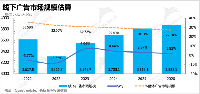 在这种情况下,我们假设线下广告市场受线上化迁移趋势减缓,分众占整体线下广告市场份额保持稳定(约4%,2021年水平)。