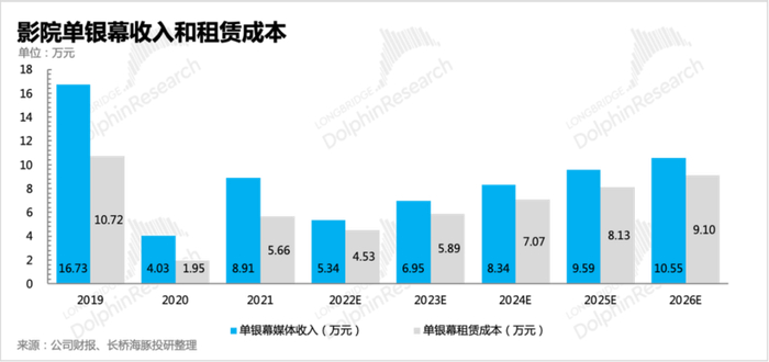 但同时假设2023年开始整体防疫政策机动性更强,院线监管逐渐落地放开,2026年单银幕创造价值以及租金均恢复至疫情前2019年的水平,总签约银幕由2022年的13600个上涨至14200个,约占2021年全国总银幕数量的17%。