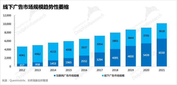 近十年来,广告线上化趋势一直存在,因此整体大盘的增长靠的是线上广告的高速增长拉动。但随着互联网流量红利殆尽(获客成本走高),以及监管趋严(App开屏广告整顿、“软广”监管、《个人信息保护法》出台、算法监管)的影响,以效果广告为主的互联网广告面临着广告主在预算分配上的重新评估。