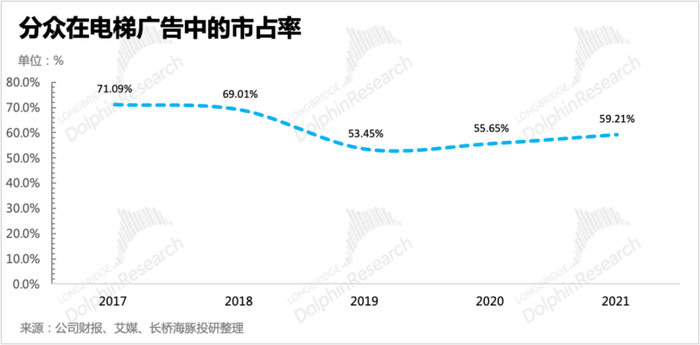 当前梯媒的竞争格局,分众仍然是占了半壁江山的,虽然在2018~2019年的激烈的价格竞争下,市占率已经相比2017年之前的巅峰期,被同行分食不少,但还是位居首位。