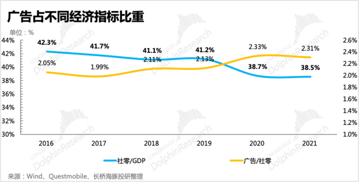 不过由于打广告一般是To C消费类企业较多,因此可以将上述的营销占比进一步拆解为“广告占社零的比重”以及“社零占GDP的比重”。