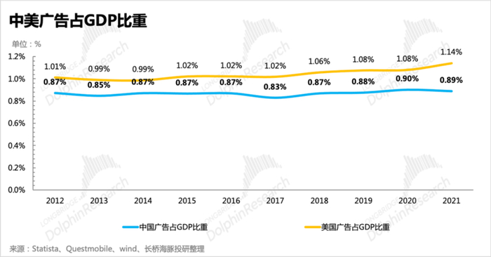 中国的营销支出占GDP比重徘徊在0.8%~0.9%区间,随着国内企业对品牌影响力的关注度提升,可以期待总营销占比能够提升到0.9%以上的水平。