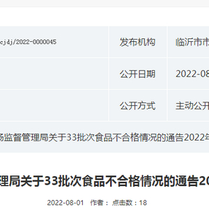 中国质量新闻网讯 近日,山东省临沂市市场监督管理局发布关于33批次食品不合格情况的通告2022年第18期。