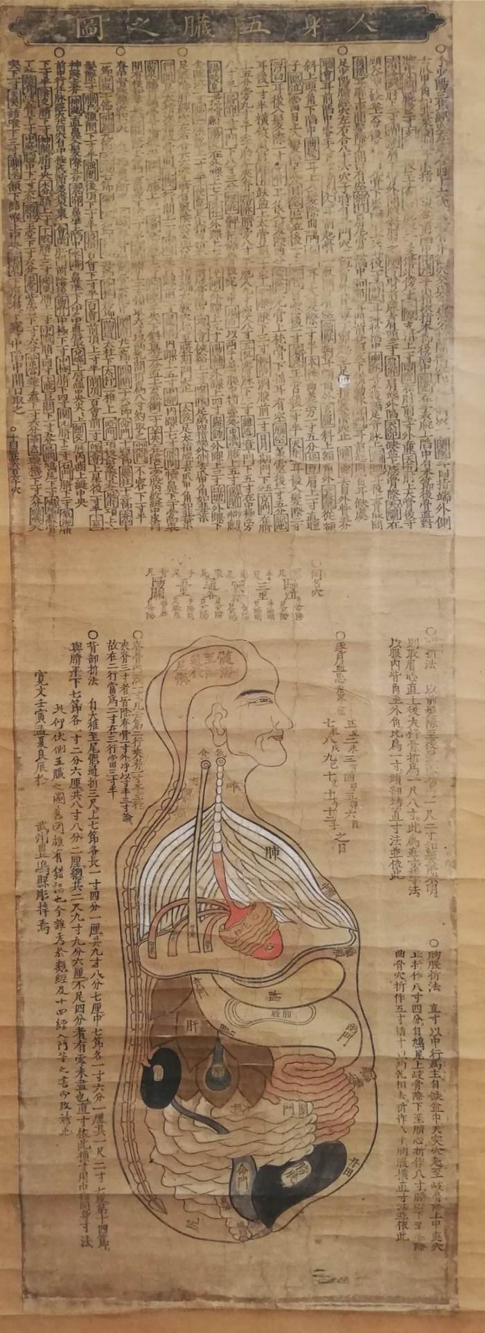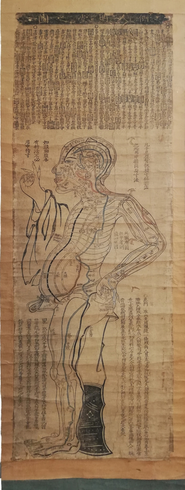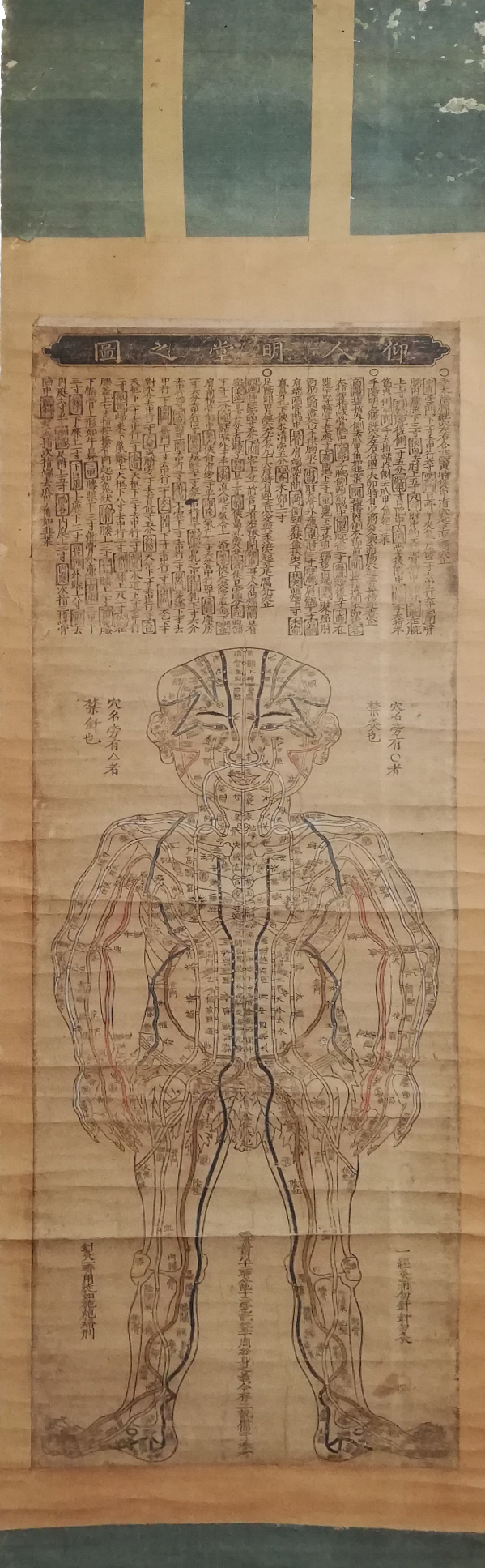 英国古书商梭寇(Sokol Books)带来了一套四幅的卷轴挂图 ,分别以人体的正面、反面、侧面和五脏显示经络穴位,一般中医店都看得到类似的挂图或海报,但几乎都是现代机器平版印刷大量生产,梭寇展出的则是木刻雕版印刷,且手工上色,以金木水火土五行的对应颜色(白、蓝、黑、红、褐)彩绘经络与脏腑,人身五脏之图文末一行字“宽文壬寅孟夏良辰于武州丰嶋县雕梓焉”,说明此套图的雕版制于日本江户幕府时期宽文二年(1662)初夏。中医甚早前就传至日本,这套图应是参照明末之前的版本,图中也说明“此仰伏侧五脏之图旧图颇有错误也今杂考于类经及十四经入门等之书而改补也”。梭寇的这套和刻版中医挂图标价为27,500英镑。