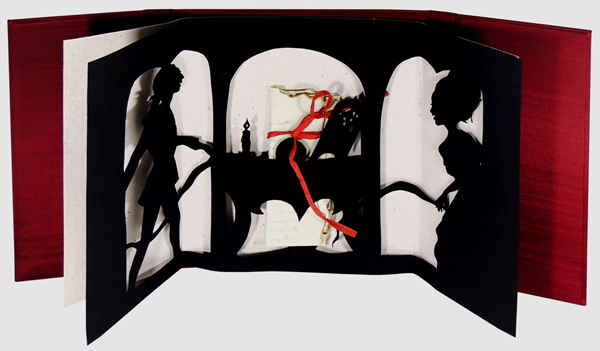 古书展不时会出现一些现代艺术家手工小量制作、非传统型的概念书,在材质与形式上都考究,把书视为艺术品来创作,因此称为“艺术家手作书”(Artists' books),它们虽然年代不久远,但属于值得收藏的珍本书。逛凯姆斯考特书店(Kelmscott Bookshop)的摊位时,看到一个像三折画的立体剪影手工书,左右各为一 男一女,中间书桌上方,以红线绑了一张折叠的烟熏纸页,打开后是一首十八世纪的法文诗《那个字与那件事》(