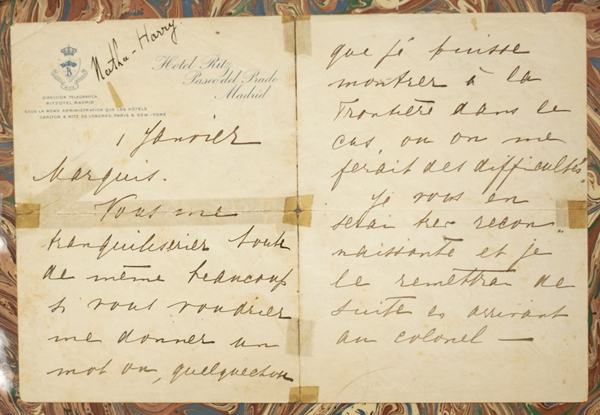 西班牙的女性古书商叶莲娜·嘎耶勾(Elena Gallego)在会场中展出的一封信件也引起我的兴趣,那是玛塔·哈里(Mata Hari,1876-1917)亲笔写的求救信函。玛塔·哈里原是荷兰人,在巴黎发迹,是二十世纪初知名的艳丽舞星、交际花,以妩媚性感、异国风情的外貌与气质著称,第一次大战期间周旋于欧洲诸国的社会名流与军政要人间并成了双重间谍。玛塔·哈里在这封信里要求一位侯爵能给她通过战区边境的文件,信上的日期是1917年1月1日,信纸抬头显示是西班牙马德里的丽池大酒店(Hotel Ritz Madrid)她当时是以假名马斯洛夫伯爵夫人(Countess Maslov)入住,现今这旅店餐厅的一间十人包厢还以马斯洛夫伯爵夫人命名。玛塔·哈里同年2月在巴黎被捕,10月被枪毙处死,罪名是通敌,担任德国间谍,因泄漏重要机密而导致数万法国人阵亡,玛塔·哈里一时间也成了蛇蝎美人的代名词。