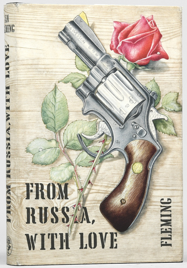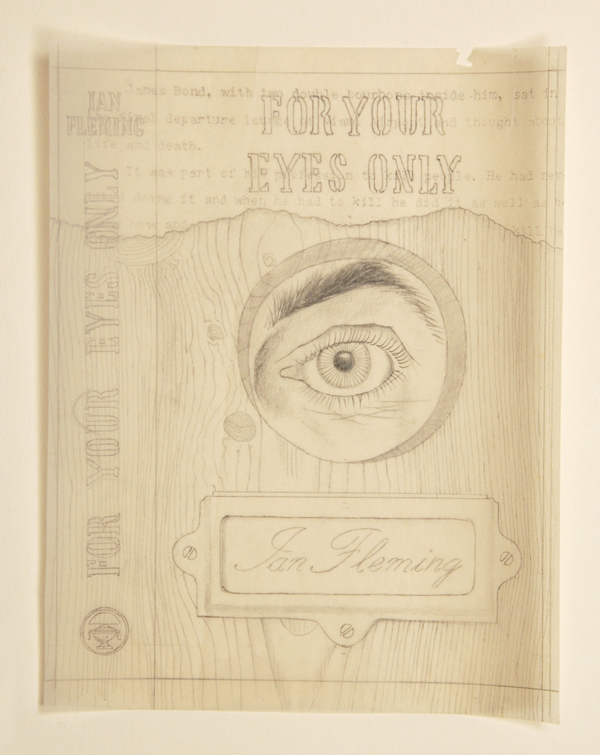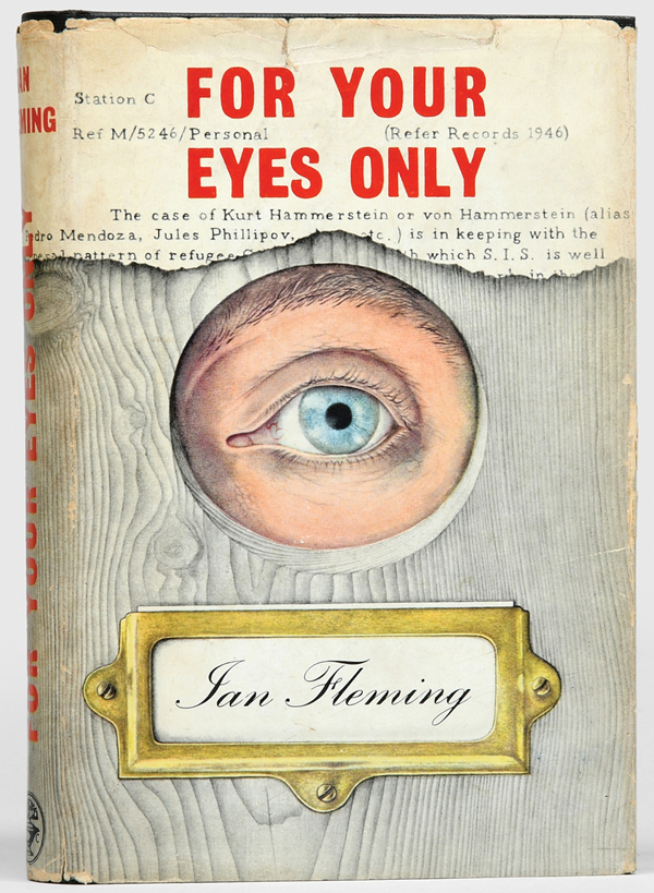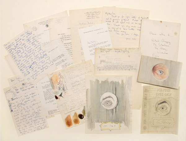 另一组对象是007系列作者伊恩·弗莱明(Ian Fleming)与他出版社的版权代理人麦克·豪尔德(Michael Howard)以及他最爱的书衣设计师李察·洽平(Richard Chopping)间的二十二封通信,另含洽平手绘的黑白与彩色设计草稿,这些文图记录了关于1960年《最高机密》(For Your Eyes Only)这本书首版书衣的设计发想与创造过程,以及作者、设计者、出版社三方对设计费既委婉又坚持的各自表述。信中可看出弗莱明很欣赏洽平的才华,央求他未来都得继续帮忙设计;007系列从1957年第五本《俄罗斯之恋》(From Russia, with Love)开始,书衣设计几乎都由洽平包办,我虽非007控,但从编辑和营销的眼光,不得不说洽平的设计风格,是让007系列在读者与藏家心中加分的重要因素。谁都忘不了《最高机密》那只在档案夹上方窥视孔出现的眼睛、《金手指》(Goldfinger)那个咬着一朵鲜红玫瑰的骷髅头,以及《你只活两次》(You Only Live Twice)那只压着猎物(蜻蜓)的癞蛤蟆配上一朵硕大粉色菊花的反差画面。而今 一本首版的007小说,只要书衣品相佳,价格往往由万美元起跳。彼得·哈林顿展出的这批《最高机密》书信与设计稿档案,订价为7万5千英镑;现今大家都用计算机做稿、网络联络,文字图像全都数字化,这批档案宛如保存完好的考古遗迹般珍奇。