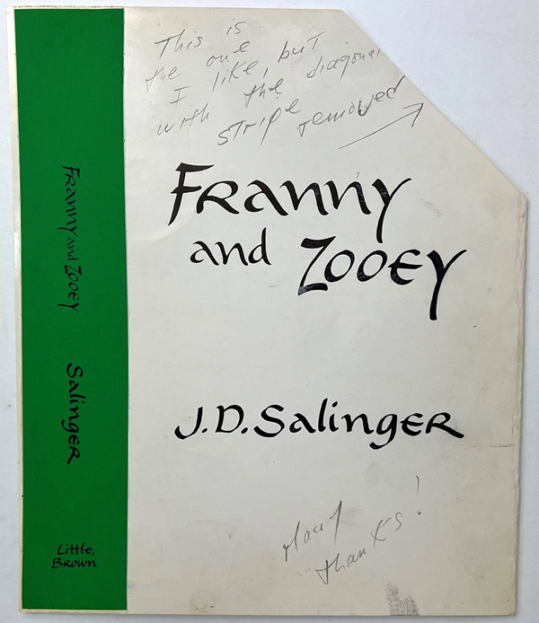 古书展经常也陈售一些与书籍制作相关的对象,这次有两批对象令我印象深刻,其一是英国约克的古书商陆雪斯(Lucius Books)展出塞林格第三本著作《弗兰妮与祖伊》(Franny and Zooey)1961年首版的两个书衣设计样稿。第一款是蓝、白各半的色块加上不规则粗细的红色线框,书商附了张1961年5月10日塞林格写给编辑的信的影印稿,信上表示他收到书衣设计稿,并写着:“我觉得好极了,那种蓝色非常好,我也觉得红色线框线较佳,比黑色要活泼许多。”他还提到字体、纸张光泽的问题,最后他对不时提出的设计改动而致歉;信中所指,明显是陆雪斯展出的第一款,想必塞林格当时很满意。另一款设计稿的字体与前一款同,但少了红色线框,且成了大片的白色块,仅有沿书脊部分的边缘是绿色,且右上角被剪去,封面上有塞林格的铅笔字迹“这款我喜欢,但斜条纹要移除。非常感谢!”他还画了箭头标示右上角,可知这被剪去的部分(不知何人所为)原本是斜条纹。《弗兰妮与祖伊》最终用的是白与绿的第二款设计,想来塞林格在折腾一番后,又改变了心意。