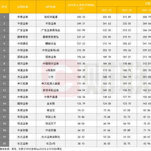 与年初相比,排名前20的券商App DAU均实现超过两位数的增长。上半年DAU排名前5位的券商App中,国泰君安、华泰证券均增长超过12%,广发证券增长超过11%,平安证券、中信建投增长超过10%。