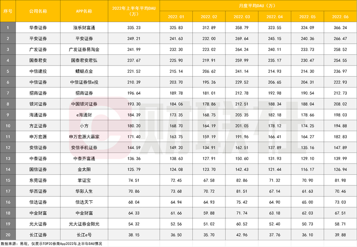 根据易观统计的上半年券商App DAU数据显示,2022年上半年,排名前三的分别是,华泰证券涨乐财富通App的平均DAU335.23万、平安证券App的249.21万,和广发证券易淘金App的 241.99万。