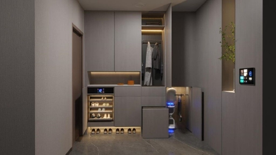 为了实现空间的最大化利用,嵌入式智能柜体成为新潮流,将智能与全屋设计巧妙融合。以玄关为例,以往的产品提供者会想当然地认为,人们进入家门第一步需要打开灯,打开窗帘。但事实上,大部分人要先放包,手部消毒,然后搬个凳子坐下来换双鞋,把鞋放到鞋柜里,把大衣挂起来。这才是用户回家的真实动线。