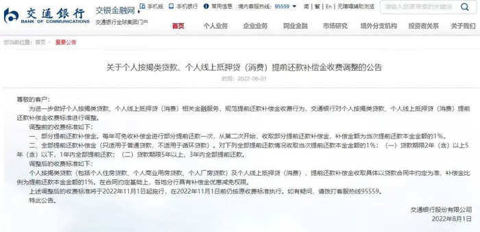 交行8月1日在官网发布的一则《关于个人按揭类贷款、个人线上贷款抵押贷(消费)提前还款补偿金收费调整的公告》称,“提前还款补偿金收费”。