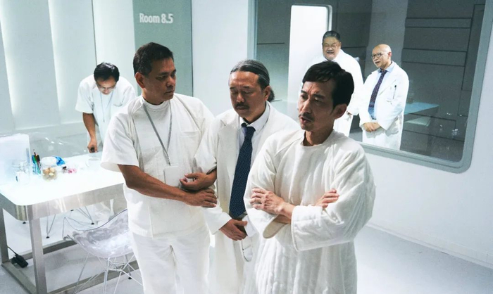 不同于正常的病人,张达明饰演的这个病人,一会儿说自己是许鞍华,一会儿又说自己是杜琪峰,甚至还拿手指对着坐在对面的张锦程,模仿香港枪战片中的模样。总之,张达明饰演的这个角色,一看就非常神经质。其实,这也是徐克导演最想要的效果。