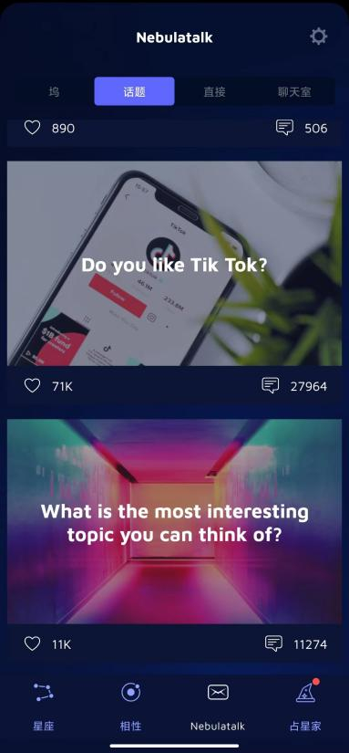 Nebula 在个人星盘分析与好友功能之外,增添了占卜师咨询、社区等功能,整体功能设计上可以横向对照国内的“测测”。在 Nebula 的社区功能中,一共设计“Feed”(用户自发贴文)、“Topics”(官方设定话题,用户讨论)、“Direct”(私信)、“Room”(匿名文字聊天室)四个板块。
