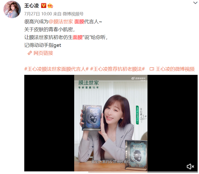 自《乘风破浪3》开播后,王心凌先是在6月2日解锁金典有机生活星推官这一新身份。此后,王心凌不仅又解锁了FAB急护美人新晋品牌大使、fresh馥蕾诗火山茶精华推荐官、可口可乐蜜桃味新品推荐官、希思黎彩妆香氛大使等更多身份,还在7月27日官宣成为膜法世家品牌面膜代言人。