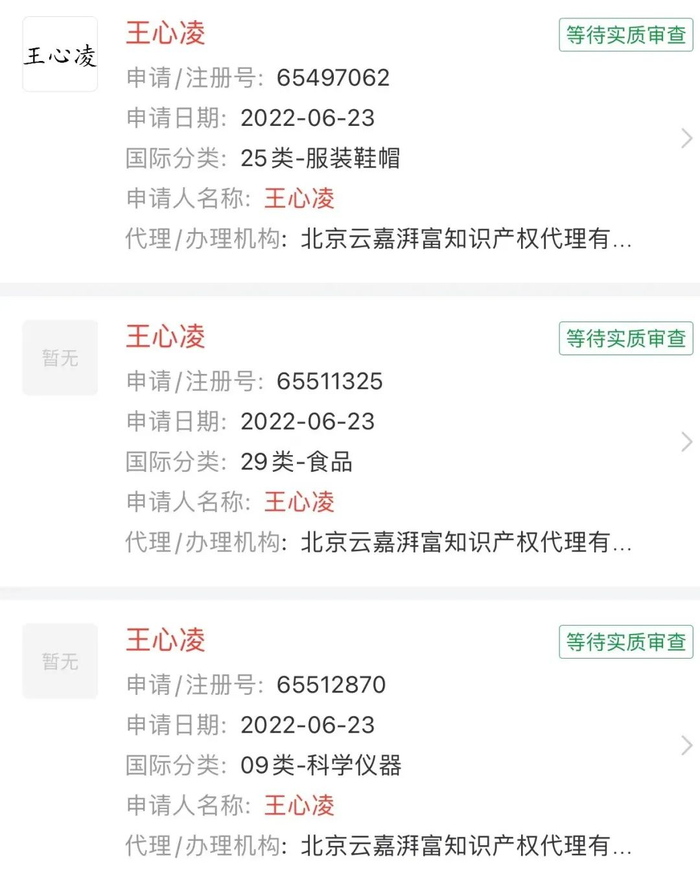 另据天眼查App显示,近日,王心凌申请注册45个国际分类的“王心凌”商标,当前商标状态均为“等待实质审查”,这也令人们好奇后期是否会有更多的布局。