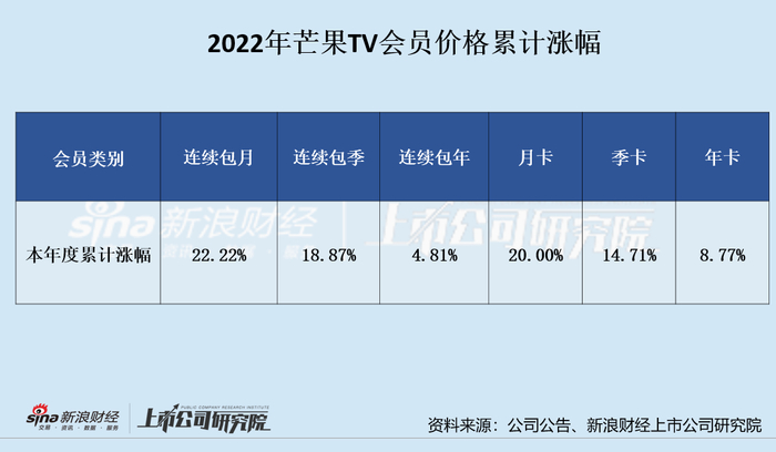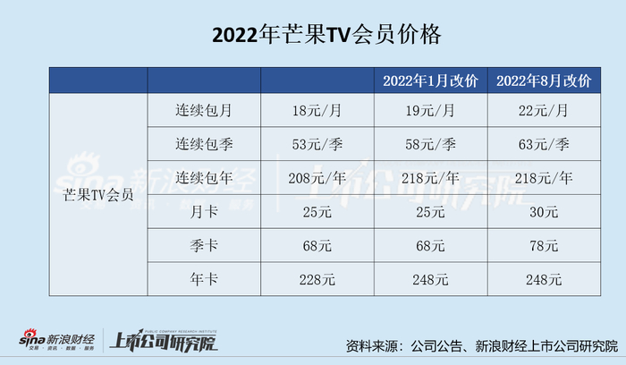 7月27日,芒果TV发布涨价通知称,2022年8月9日零时起,芒果TV会员连续包月价格将从19元上调至22元、连续包季价格将从58元上调至63元、会员月卡价格将从25元上调至30元,季卡则从68元上调至78元。此外,年卡和连续包年价格未做调整。