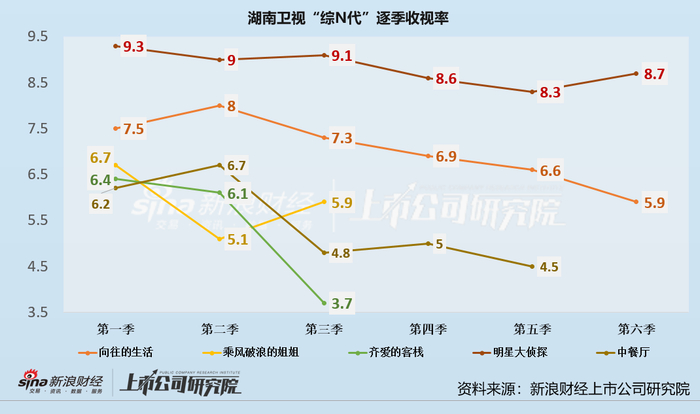 首先,从综艺口碑角度看,不少芒果TV“综N代”强IP或已进入过度消耗阶段,未来可持续性不容乐观。通过芒果TV分季豆瓣评分,我们或也能看出些端倪,以今年播出就饱受争议的热播综艺《向往的生活》为例,自该综艺第二季播出后,豆瓣评分持续下滑,第六季的评分仅有5.9。同样口碑下滑的,还有中餐厅,第五季的豆瓣评分仅有4.5.