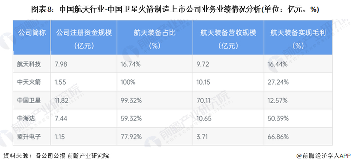 总体来看,目前中国卫星火箭制造行业企业主要为央国企,各大公司注册资金均在1亿元以上,相关上市公司业务业绩情况如下: