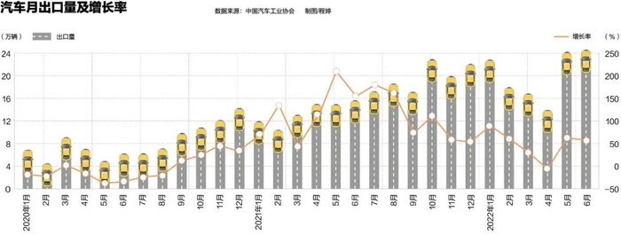 今年上半年,汽车出口121.8万辆,同比增长47.1%。其中,6月出口24.9万辆,环比增长1.8%,同比增长57.4%。这是中国汽车工业协会(以下简称中汽协)统计的汽车出口的“成绩单”,不易之处在于,这是在2021年汽车出口数据已经大幅增长的前提下,再次创下历史新高。