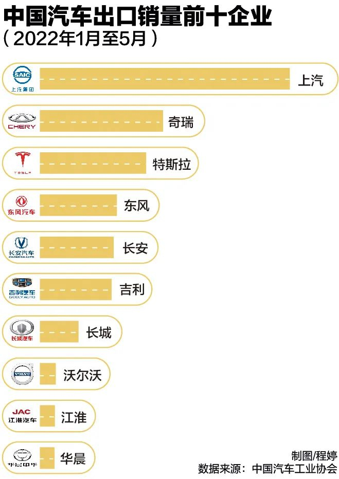 按照中汽协统计,特斯拉2021年出口量在车企中排位第三,其余排名前五的车企分别为上汽、奇瑞、长安和东风。2022年1~5月汽车出口总量为74.65万辆,其中上汽集团的汽车销量为22.62万辆,占比最高,其次为奇瑞集团汽车销量,达到11.14万辆,特斯拉出口了9.62万辆。