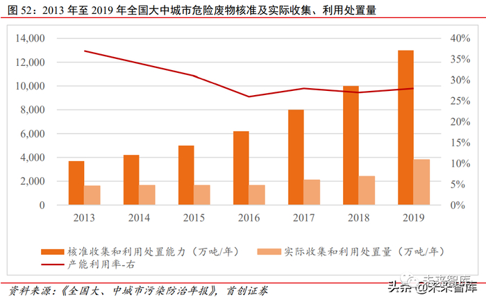2. 许可产能快速增长但利用率不足 《两高司法解释》的出台及升级,促进了危废处置需求快速增长。同时,自 2013 年 以来,核准产能呈同步快速增长状态,处置产能加快建设。2013 年,全国大、中城市核 准产能不及 4000 万吨/年,到 2019 年已经超过 12000 万吨/年。