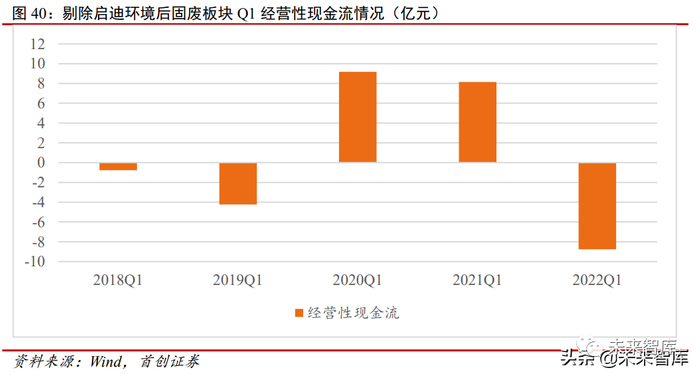2022 年第一季度,板块经营性现金流大幅减少。2022 年一季度板块经营性现金流 为-9 亿元,较去年同期由正转负。板块内大多数公司现金流恶化,浙富控股、瀚蓝环境、 中国天楹、中再资环、东江环保现金流下降幅度较大。其中浙富控股主要由于支付期货 合约保证金、生产备料支付货款、支付的各项税费上升导致现金流恶化;瀚蓝环境则受 《会计准则解释第 14 号》影响,以及能源业务亏损、应收账款回款尚未改善等拖累;东江环保因增加子公司营运资金导致现金流降低。(报告来源:未来智库)