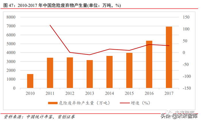 1. 危废市场规模快速增长 随着我国经济以及工业生产的快速发展,我国危废的产量也持续提升。同时,2013 年最高人民法院、最高人民检察院联合下发的《关于办理环境污染刑事案件适用法律若 干问题的解释》(下称《两高司法解释》),以及 2016 年《两高司法解释》的升级,促进 了之前“隐性”危废的“显化”释放,危废市场统计规模快速增长。根据《中国统计年 鉴》,2013 年我国危废产生量为 3156 万吨,到 2017 年已达 6936 万吨,年复合增长率达 22%。