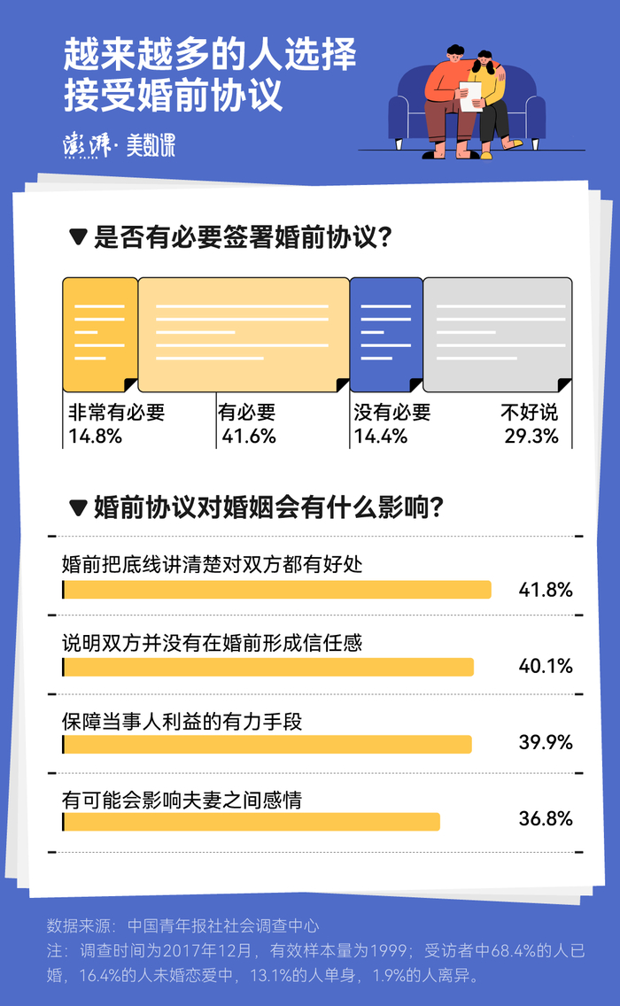 上文提到的中国青年报调查显示:尽管接受婚前协议的人越来越多,但依然有多达 40.1% 的受访者认为这表明了双方并没有在婚前形成信任感。