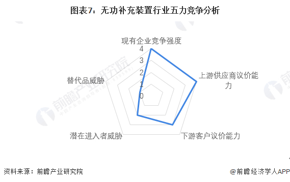 根据以上分析,对各方面的竞争情况进行量化,5代表最大(竞争激烈/威胁大/议价能力强),0代表最小(竞争小/威胁小/议价能力弱),无功补充装置产业的竞争情况如下图所示。