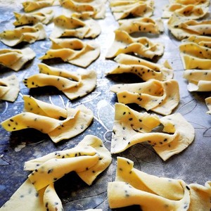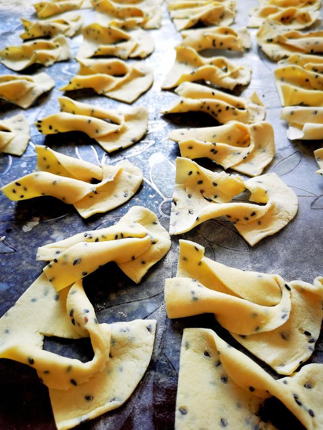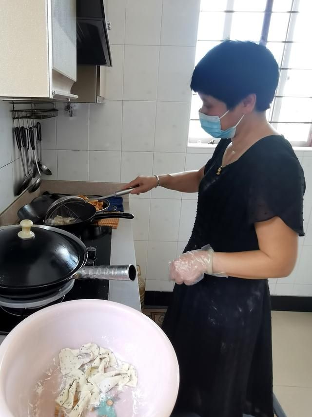 和好面,擀成薄至1毫米的面皮,再切成尺寸均匀的小块……大家配合娴熟,很快,待油炸的巧果生胚便摆满了桌面。“放油里炸至金黄色即可,爱吃甜的放糖,爱吃咸的放盐。”村民吴美花说,巧果做法容易,又香又脆,美味极了。