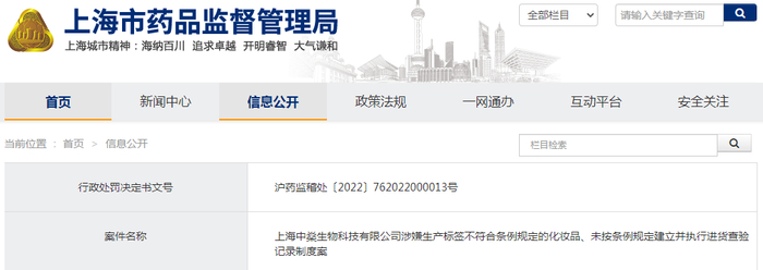 案件名称 | 上海中燊生物科技有限公司涉嫌生产标签不符合条例规定的化妆品、未按条例规定建立并执行进货查验记录制度案 |