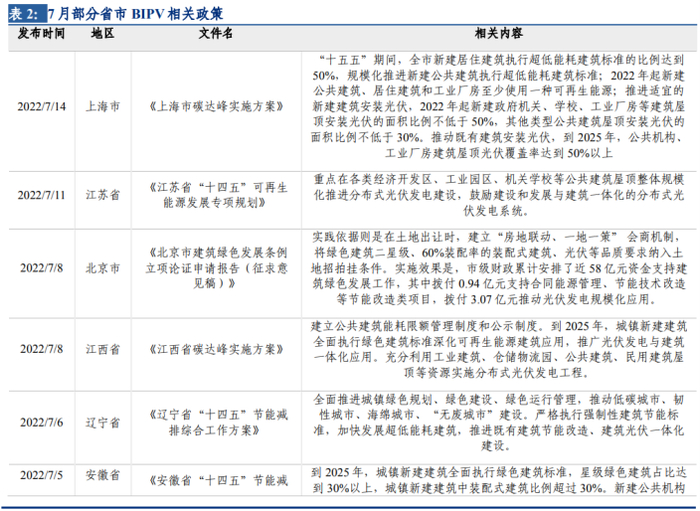 国家层面,7月13日,《城乡建设领域碳达峰实施方案》发布,要求推进建筑太阳能光伏一体化建设,到2025年新建公共机构建筑、新建厂房屋顶光伏覆盖率力争达到50%。