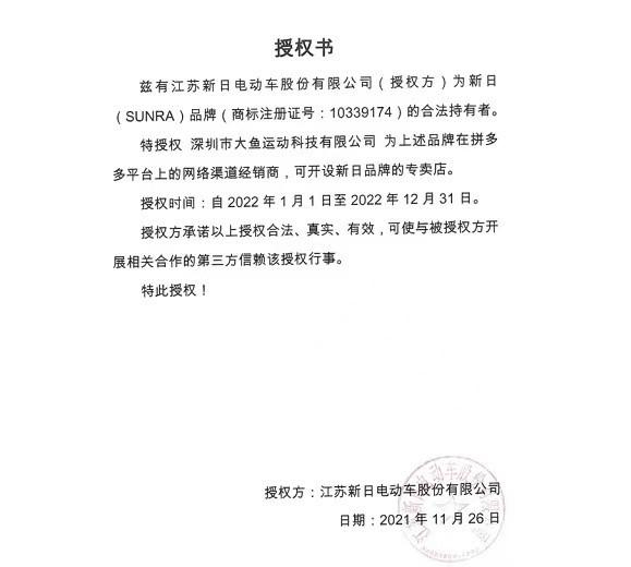 上海正策律师事务所合伙人律师沈海东向澎湃新闻指出,品牌授权一般有“授权销售”和“授权制造”两种。简单来说,前者指商标权人授权经销商售卖自己的产品,后者则是俗称贴牌生产,授权其他厂商在自己的产品上使用品牌方的商标。而新日公司出具的授权书显示,其授权了拼多多平台入驻店铺作为“新日”品牌的专卖店,授权商标使用范围为“电动车辆”类。
