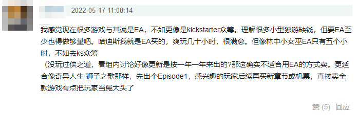 但这种“EA初销量占大头”的情况,自然而然就导致了一种“边际效应递减”,即投入同样的开发成本,EA后期的商业回馈反而是不如E A初期的,这也就降低了开发者“酬勤”的意愿。