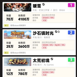 前段时间,国游销量吧公布了2022国游销量半年榜(仅统计买断制游戏),国风动作肉鸽《暖雪》与模拟经营游戏《沙石镇时光》领跑榜单。