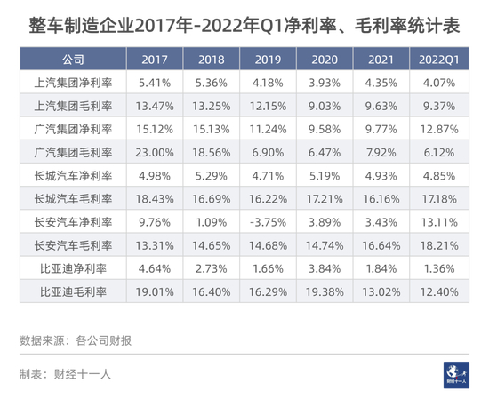 虽然整车厂都在抱怨动力电池等上游供应商的价格上涨给它们带来了巨大压力,但从毛利率和净利率上看,这种影响尚不明显,主要原因是这些大型汽车集团目前的营收和利润依然主要来自燃油车,受动力电池价格变动影响有限。但电池成本上升对新能源车制造商的影响就比较明显,例如已经全盘切换到新能源车的比亚迪,以及造车新势力。