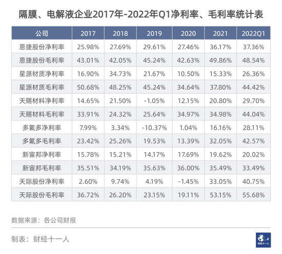 电解液是这一轮原材料价格飞涨的起点,目前看也是价格高涨的最大受益者之一。天赐、多氟多、天际、新宙邦等公司的利润率数据都从2020年开始快速上升。但与正负极企业类似,电解液企业也在2018年开始的市场疲软当中受损严重,这两年价格暴涨,利润猛增对多数电解液企业来说,是在恢复元气。
