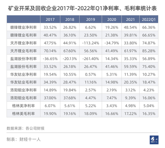 从利润表现看,锂矿企业的确收获巨大,2022年第一季度天齐锂业的毛利率超过85%。赣锋锂业的工作人员不无调侃地说:“看到了天齐的财报,就觉得以后有兄弟可以分摊炮火了。”
