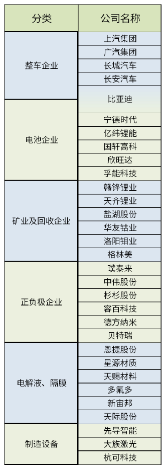 1、将新能源车产业链分为六个环节:整车制造、动力电池、正负极、隔膜及电解液、矿业开采及回收、制造设备。