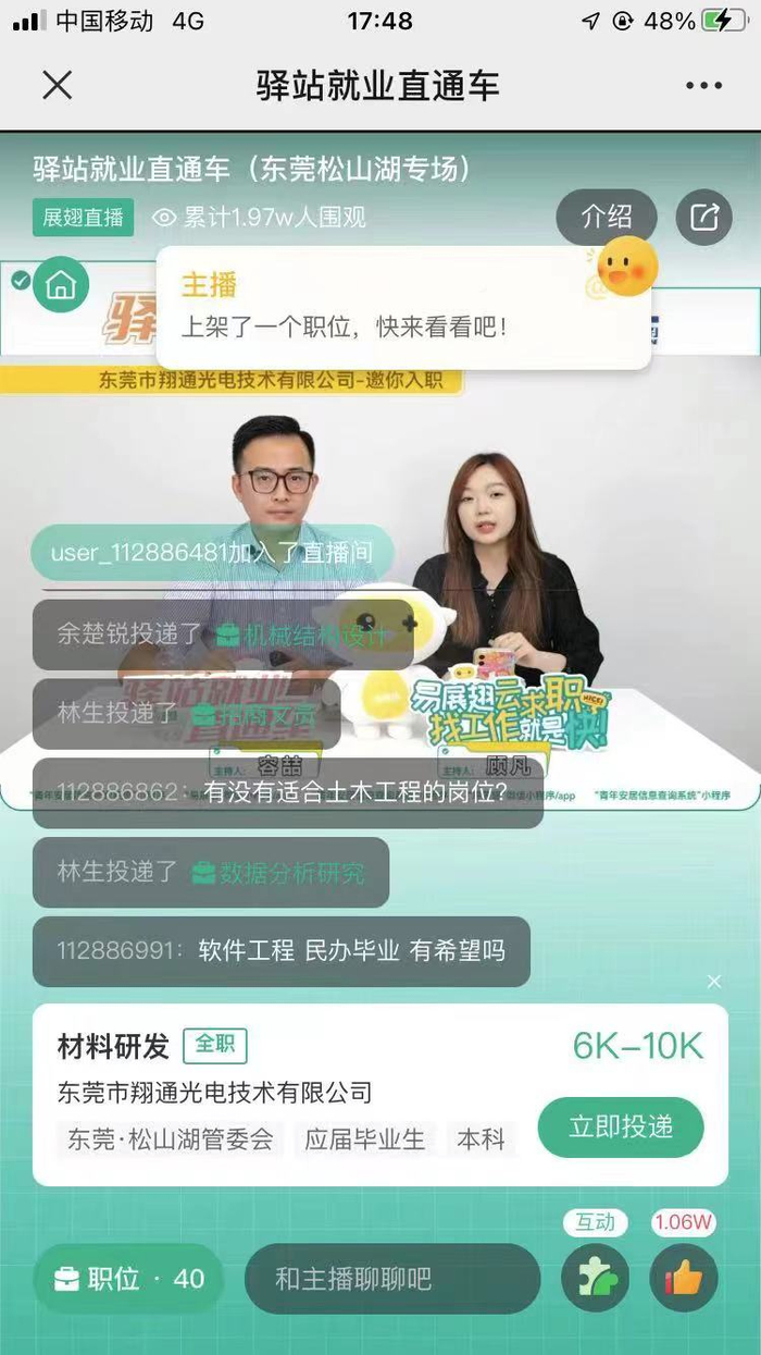 应届毕业生小李抱着试一试的心态进入广东共青团“驿站就业直通车”首场直播活动。令他惊喜的是,这次推荐的岗位质量都很高,让他十分心动。“我一直在找东莞的招聘信息,这次终于有机会投简历了。”据统计,本场直播共有7家企业提供82个岗位,覆盖光电、化学、生态环保、数据分析、产城融合等领域。
