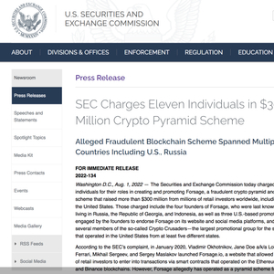 根据SEC披露的信息,在被指控的人员团体中,除了4名Forsage的创始人外,还有3人负责在社交平台进行营销推广的工作人员,另有一位来自游戏“加密十字军”(Crypto Crusaders)团体的成员。监管机构表示,Forsage在未经注册证券发行和销售的情况下,上述团体就擅自进行了推广和营销,并且至少已在美国五个州完成操作。