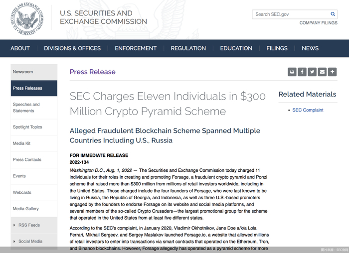 近日,美国证券交易委员会(SEC)官网于当地时间8月1日,披露了Forsage创办及营销团队等11人涉嫌参与加密货币庞氏骗局,涉案金额超3亿美元,约合人民币20亿元,数百万散户投资者卷入其中。