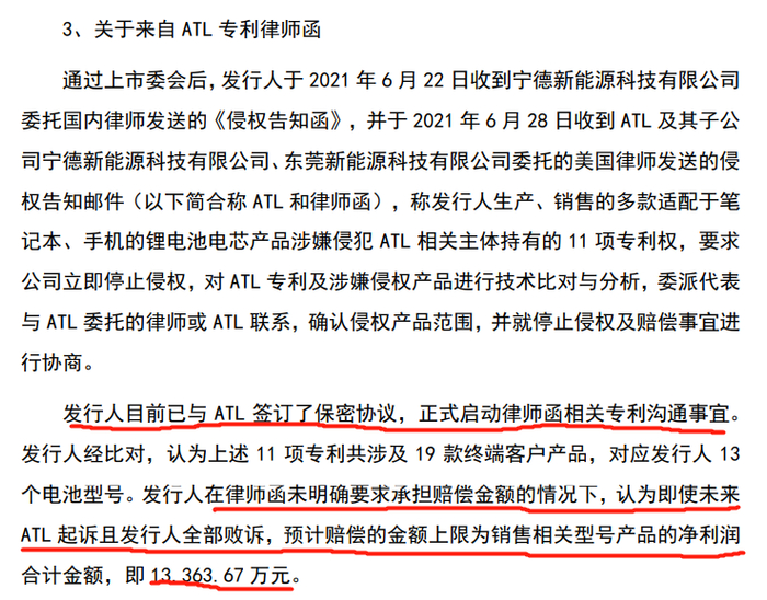 2021年6月,珠海冠宇就收到了宁德新能源委托国内律师发送的《侵权告知函》及来自ATL及其子公司宁德新能源、东莞新能源委托的美国律师发送的侵权告知邮件,称其生产、销售的多款适配于笔记本、手机的锂电池电芯产品涉嫌侵犯ATL相关主体持有的11项专利权。