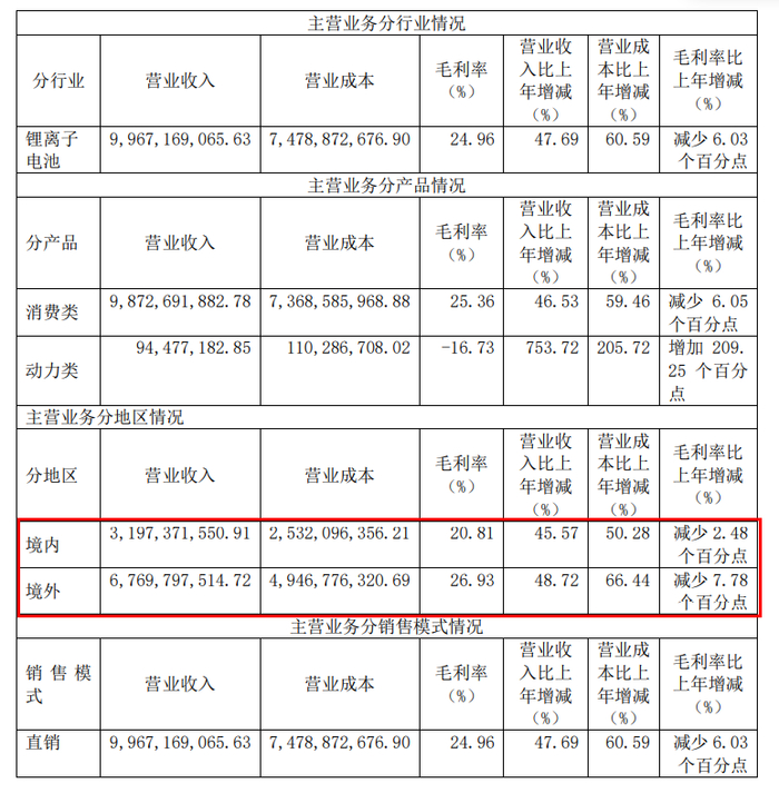目前,珠海冠宇在美国和中国两地均面临着与小电池巨头之间的专利诉讼,不难看出,企业和投资人的目光正在投向更广阔的国际市场。而从珠海冠宇公布的2021年年报来看,其境外的营业成本及毛利率均高于国内,这也说明国外的专利诉讼若是产生不利结果将会对珠海冠宇的海外市场产生掣肘。