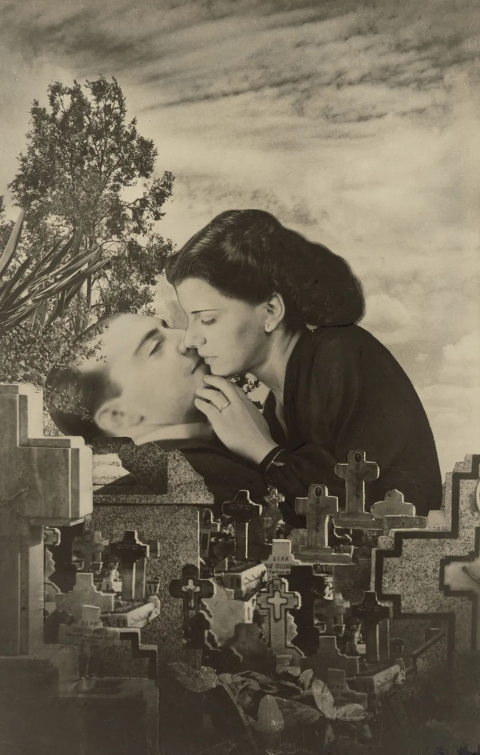 1948年,斯特恩开始为《Idilio》工作,这是一本面向阿根廷中产阶级女性的杂志,她的“梦”系列蒙太奇摄影作品就是在《Idilio》工作时的创作。MoMA在2005年举办了斯特恩与科波拉的双个展,画册的前言中写道:“斯特恩的‘梦’具有前瞻性,以超现实的技巧描绘了阿根廷社会中裴隆主义政权未兑现的女性权力。”这件作品中,恋人的吻升起在墓地之上,迷人又危险。