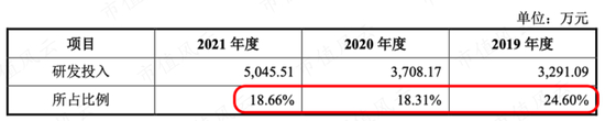 2019年-2021年分别投入研发金额分别为3291万、3708万、5045万,占营业收入比例为24.60%、18.31%、18.66%。