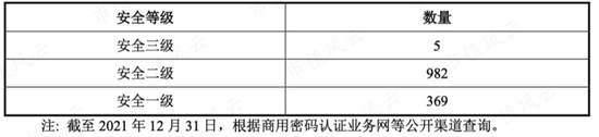 截至2021年底,国内尚无安全等级四级产品,安全三级产品只有5个。三未信安是目前仅有少数几家企业具备安全等级三级产品资质的公司。