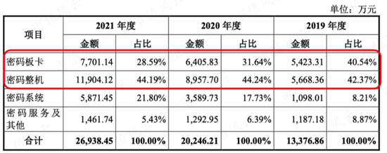 密码卡板和密码整机是三未信安收入贡献最多的产品,但密码系统收入比例在不断提高。